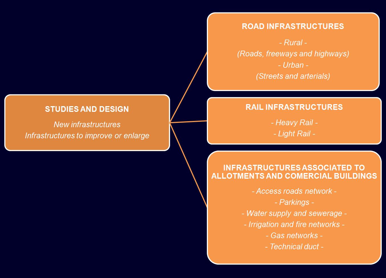 Realization of studies and design of road and rail infrastructures and other infrastructures associated with allotments and commercial areas in the various phases of development, including the realization of several specific designs.